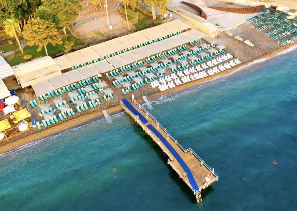 Собствен, чакълест плаж. Чадъри, шезлонги и матраци на плажа и при басейна – безплатно, плажни кърпи – срещу депозит.