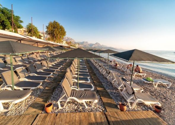 Собствен, чакълест. Чадъри и шезлонги на плажа и при басейна - безплатно. Плажни кърпи – срещу депозит.