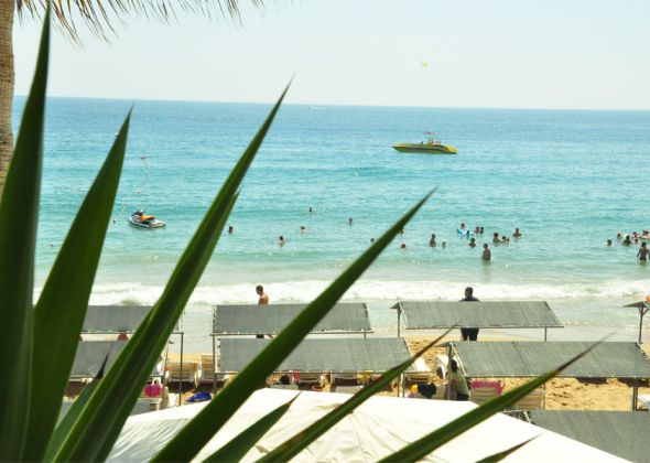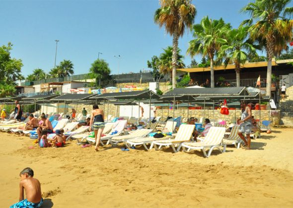 Собствен, чакълест, на 450 м, през подлез. Чадъри, шезлонги на плажа и при басейна – безплатно. Плажни кърпи – срещу заплащане.