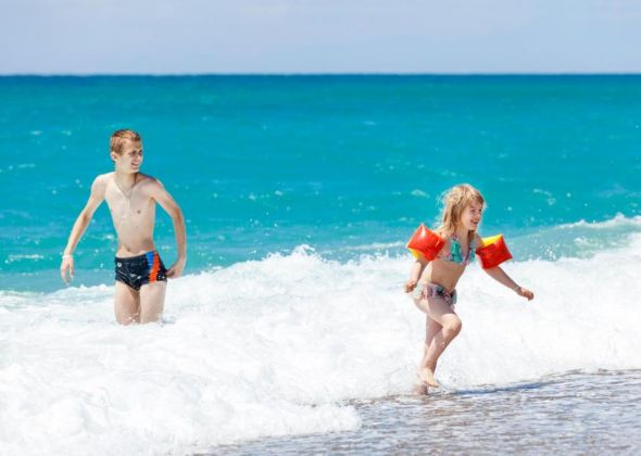 Собствен, пясъчно-чакълест плаж, на 500 м от хотела. Безплатен шатъл до плажа (по разписание). Чадъри, шезлонги, матраци и плажни кърпи на плажа и при басейна - безплатно. Душ, кабина за преобличане, спасител, бар на плажа.