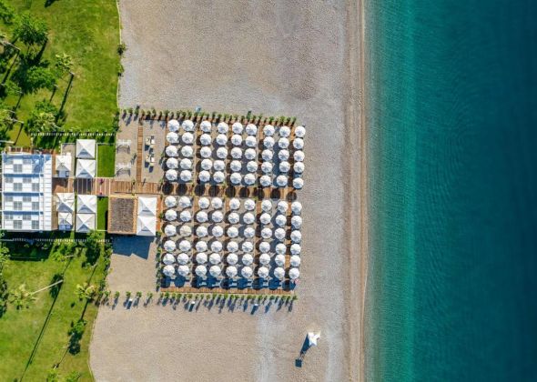 Собствен пясъчен плаж, на 400 м. от хотела. Бар на плажа. Чадъри, матраци, шезлонги, плажни хавлии - безплатно на плажа и при басейна.