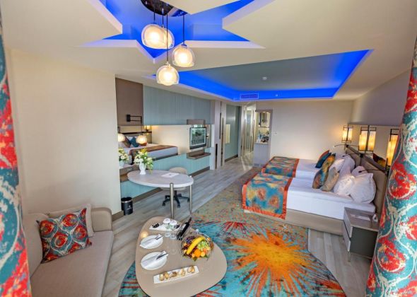 634 Superior Standard room (с изглед градина или море - 64 м2), 8 Superior Standard Disabled room (с изглед градина - стаи за инвалиди - 64 м2), 87 Family Duplex room (разположени на 2 етажа, 2 спални, 2 бани - 120 м2), 48 Family Room with connection door (с изглед градина или море - 2 спални, коридор, 1 баня - 80 м2), 8 Junior Suite (с изглед море - 1 спалня, хол, 1 баня, 1 джакузи - 140 м2), 8 Deluxe Suite (с изглед градина или басейн - 1 спалня, хол, коридор, 1 баня, 1 джакузи - 140 м2).