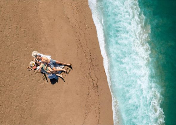 Собствен, пясъчен. Чадъри, шезлонги, матраци и плажни кърпи на плажа и при басейна - безплатно.