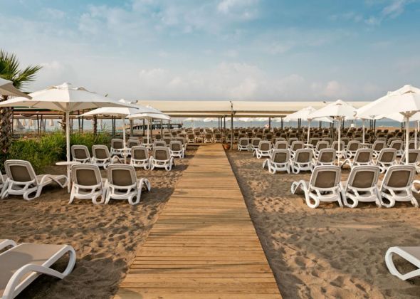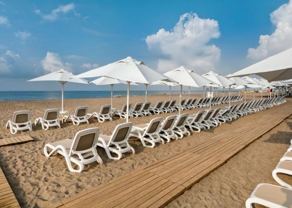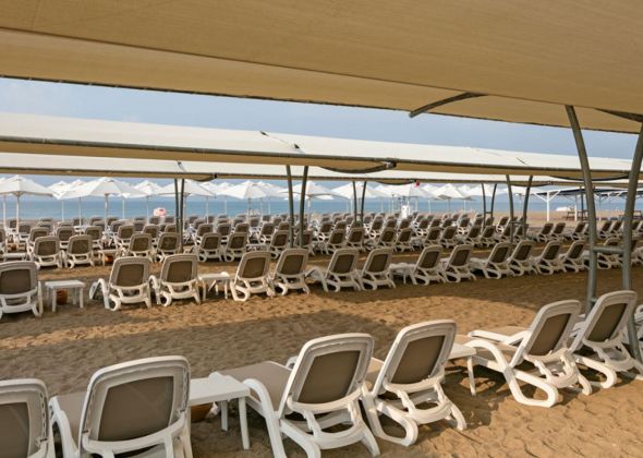 Собствен, пясъчен. Чадъри и шезлонги на плажа и при басейна – безплатно. Плажни кърпи – безплатно. Бар на плажа. Безплатен шатъл.