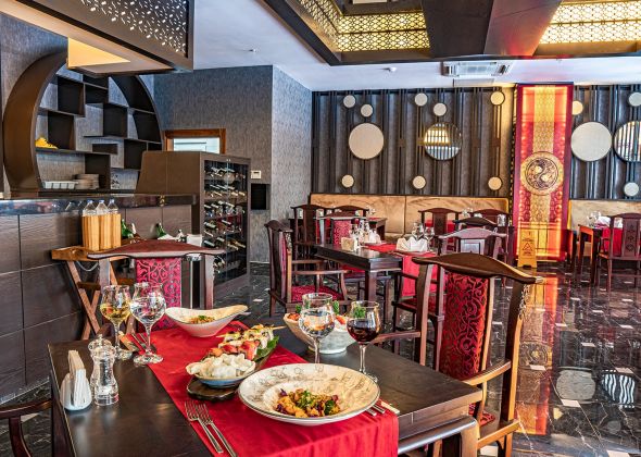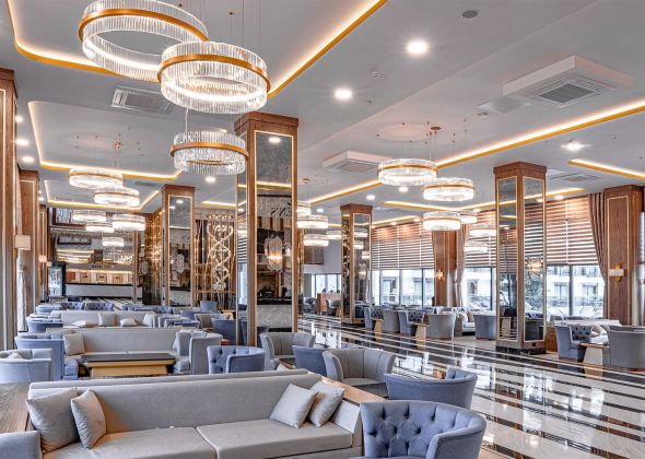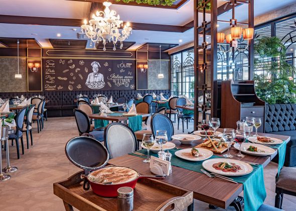 Основен ресторант, 2 а-ла-карт ресторанта (италиански и далекоизточен - 1 безплатно посещение на 1 от ресторантите при минимум 7 нощувки, с предварителна резерваия), 2 снек ресторанта, сладкарница, станция за сладолед и палачинки, 5 бара, кафетерия, диско бар, открит и закрит (отопляем) басейн, аквапарк, СПА център, магазини, конферентна зала.