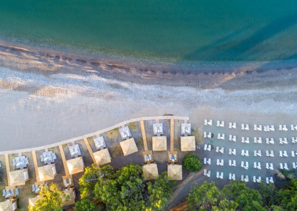 Собствен, пясъчен с камъчета, с дължина 220 м. Чдъри, шезлонги и кърпи – безплатно. Гостите имат възможността да наемат кабана на плажа между 10:00-18:00 (срещу заплащане).