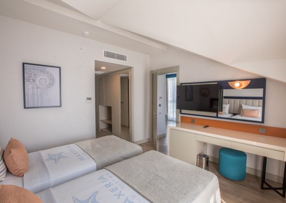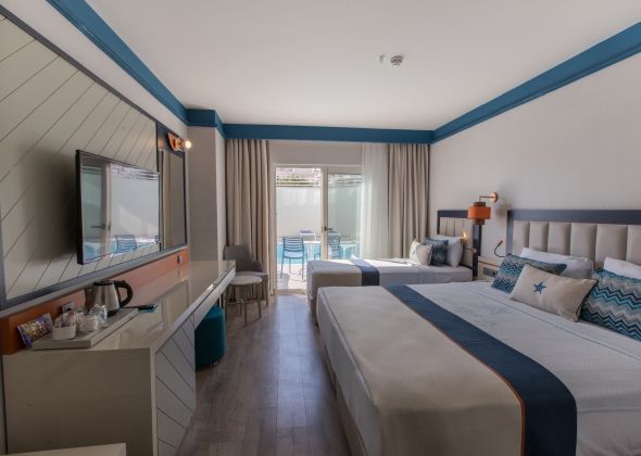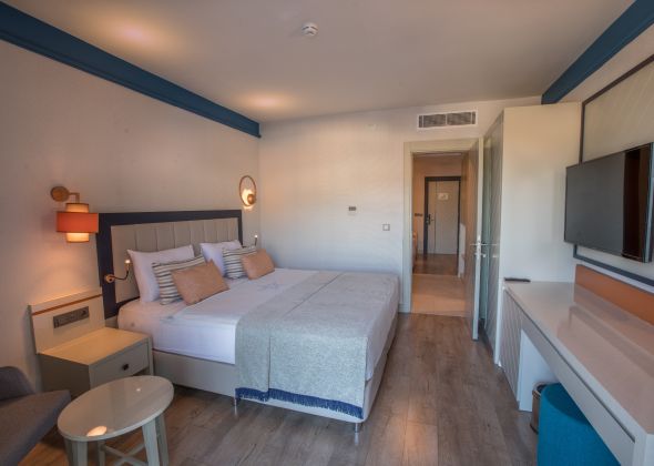 Хотелът разполага с общо 375 стаи, от които 276 Standard Room (31 м2), 74 Family Room (2 спални, 1 баня - 38 м2), 8 Swim-Up Room (директен достъп до басейна, 31 м2), 12 Junior Suite Room (38 м2), 4 Deluxe Room Sea View with Jacuzzi (31 м2), 1 Family Deluxe Room Sea View with Jacuzzi (2 спални, 1 баня - 38 м2). Всички стаи са оборудвани с климатик, телевизор, телефон, баня с душ, сешоар, минибар (зареждане - всеки ден), сет за кафе/чай, сейф (безплатен), Wi-Fi, балкон. Почистване на стаите, смяна на кърпите и зареждане на минибар – всеки ден, смяна на спалното бельо – 2 пъти в седмицата.