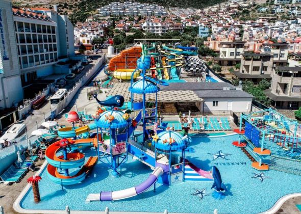 За децата: Детско меню, 3 детски басейна, водни пързалки, детска площадка, мини клуб (4-12г), мини диско, детска анимация, детска количка (с депозит/под наем).
