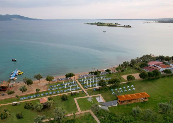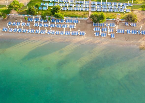 Собствен, пясъчен с дължина 150 м., притежаващ сертификат "Син флаг". Чадъри, шезлонги, матраци и плажни кърпи на плажа и при басейна - безплатно.