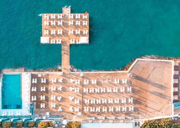Собствен, платформа и пясъчна зона. Чадъри и шезлонги на плажа и при басейна безплатно.