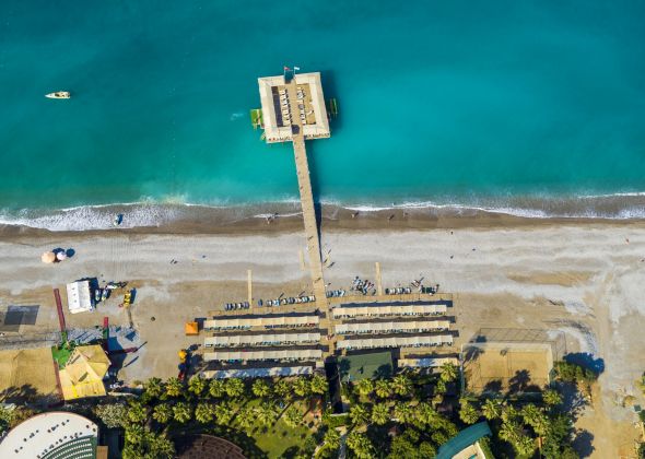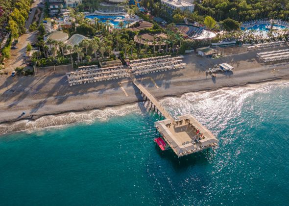Собствен, пясъчно-чакълест, кей. Чадъри, шезлонги и плажни кърпи на плажа и при басейна – безплатно.