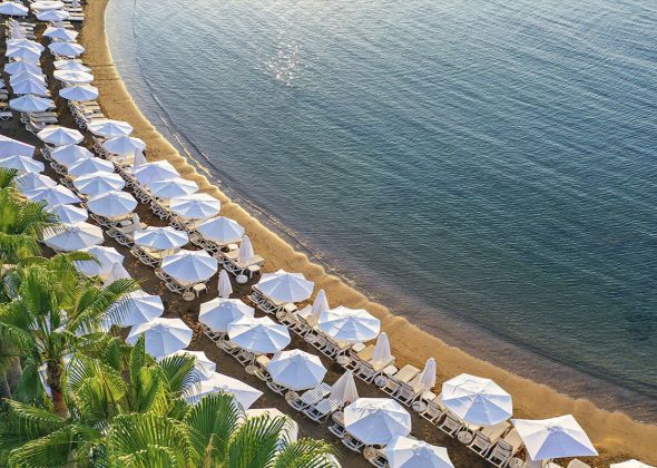 Собствен, пясъчно - чакълест. Чадъри, шезлонги и плажни кърпи на плажа и при басейна – безплатно.