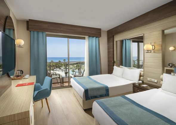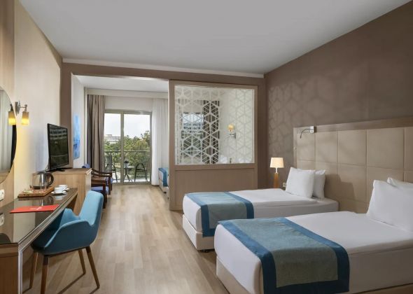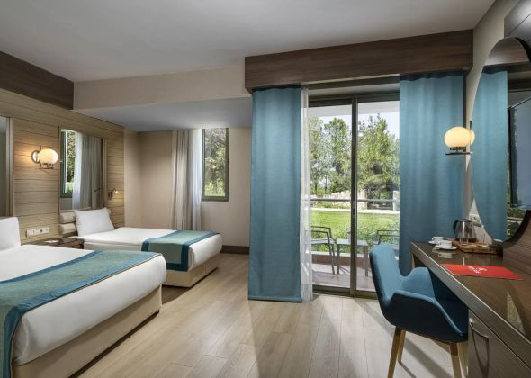 Standard room Land view (изглед суша - 25 м2), Standard room Sea view (изглед море - 25 м2), Superior room Pool view (изглед басейн - 40 м2), Superior room Lake and Garden view (изглед градина - 40 м2), Superior Garden room Terrace (с частна тераса към градината - 40 м2), Family Suite room (2 спални, 1 баня - 36 м2).