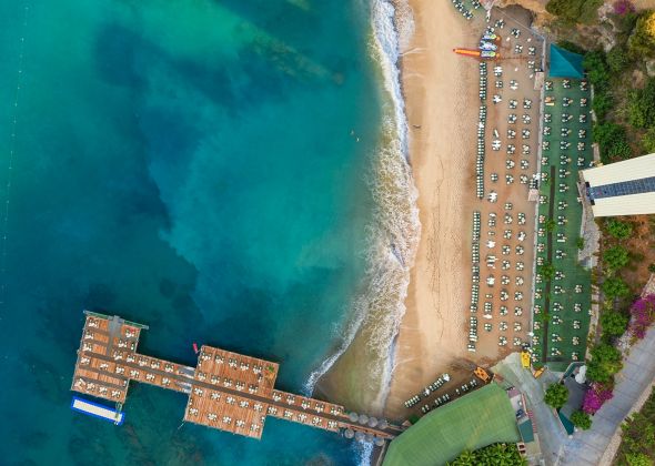 Собствен, пясъчно-чакълест плаж, на 200 метра от хотела с дължина на плажната ивица 350 м, удостоен със сертификат "Син флаг". Достъп до плажа с шатъл. Снек бар на плажа (безплатно). Чадъри, шезлонги и матраци на плажа и при басейна – безплатно. Плажни кърпи – безплатно.