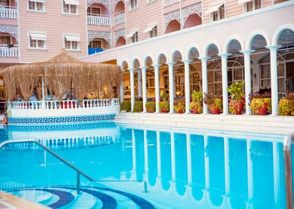 Основен ресторант ( в определени дни тематични вечери с италианска, турска, интернационална кухня и др.), 4 бара; СПА център, фитнес, 2 външни басейна, аквапарк, анимация, мини маркет, безплатен интернет на цялата територия на хотела.