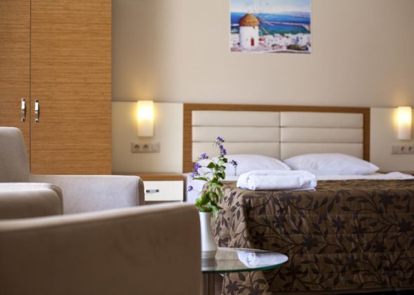 Хотелът разполага с общо 90 стаи, разположени в 3-етажна сгради, от които 70 Standard room (17 м²), 20 Large Room (35 м², спалня и двуетажно легло). Всички стаи са оборудвани с климатик, телевизор, телефон, баня с душ, сешоар, сет за чай/кафе, минибар (наличен само в деня на настаняване; безплатен за гости на All Inclusive), сейф (безплатен).