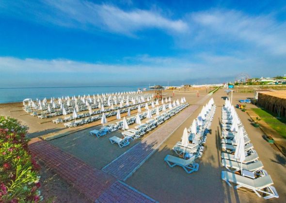 Собствен, на 200 м. от хотела, пясъчен. Чадъри, шезлонги и плажни кърпи на плажа и при басейна - безплатно.